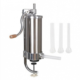 Колбасный шприц «Vanessa» 2,5 кг - ручной инструмент для набивки колбас в домашних условиях, а также для небольших мясоперерабатывающих предприятий, предприятий общественного питания. Изготовлен из нержавеющей стали. В комплект входят 4 пластиковые насадки длиной 15 см и разных диаметров - 15, 19, 22 и 25 мм, подходящие под основные виды натуральной колбасной оболочки.